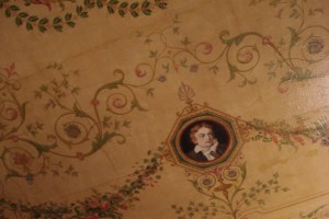 Coincidentally, a few days after that talk, I saw an advertisement for Royal Holloway’s MA in Creative Writing, one of the ‘pathways’ of which is ‘Environmental Writing’ (‘Place, Environment, Writing’). Looking at the website I saw that the accompanying photograph shows Prof Andrew Motion, the biographer of Keats, whose portrait the Garretts included in the ceiling next door, conducting a seminar in the Garretts’ drawing room. How ironic, I thought, that they should be discussing a sense of place in a place from which all sense of a past has been excluded.