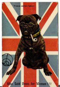 Very British Bulldog – with specs and a pipe – sits foursquare against a background of the Union Jack. It doesn’t look as though he would be interested in allowing women to vote.
