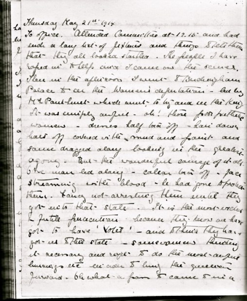 Kate’s diary entry for 21 May 1914 in which she records witnessing the WSPU demonstration in front of Buckingham Palace