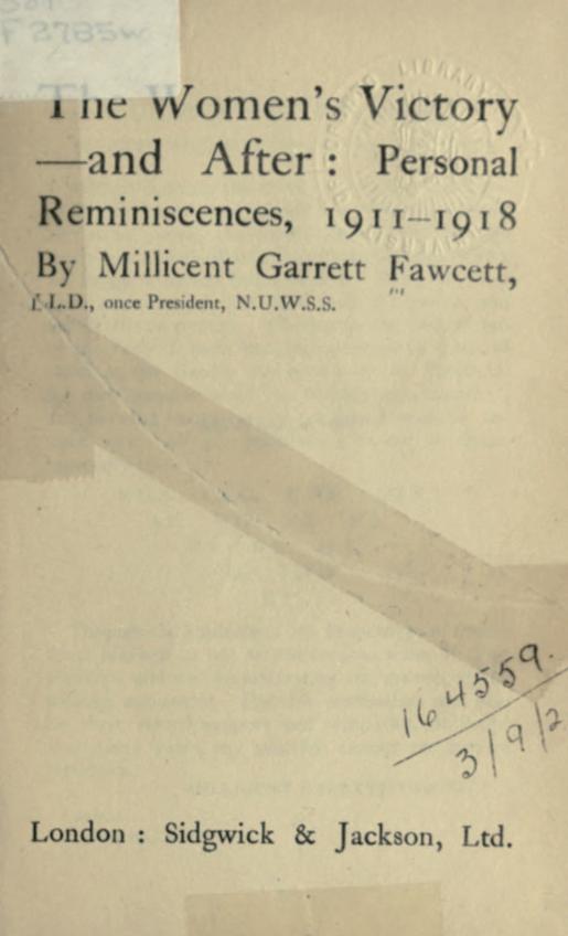 In 1920 Mrs Fawcett completed her history of the suffrage campaign, begun in A Short History, with another pithy summary of events that had led to the passing of the Representation of the People Act, 1918, granting the vote to women over the age of 30.
