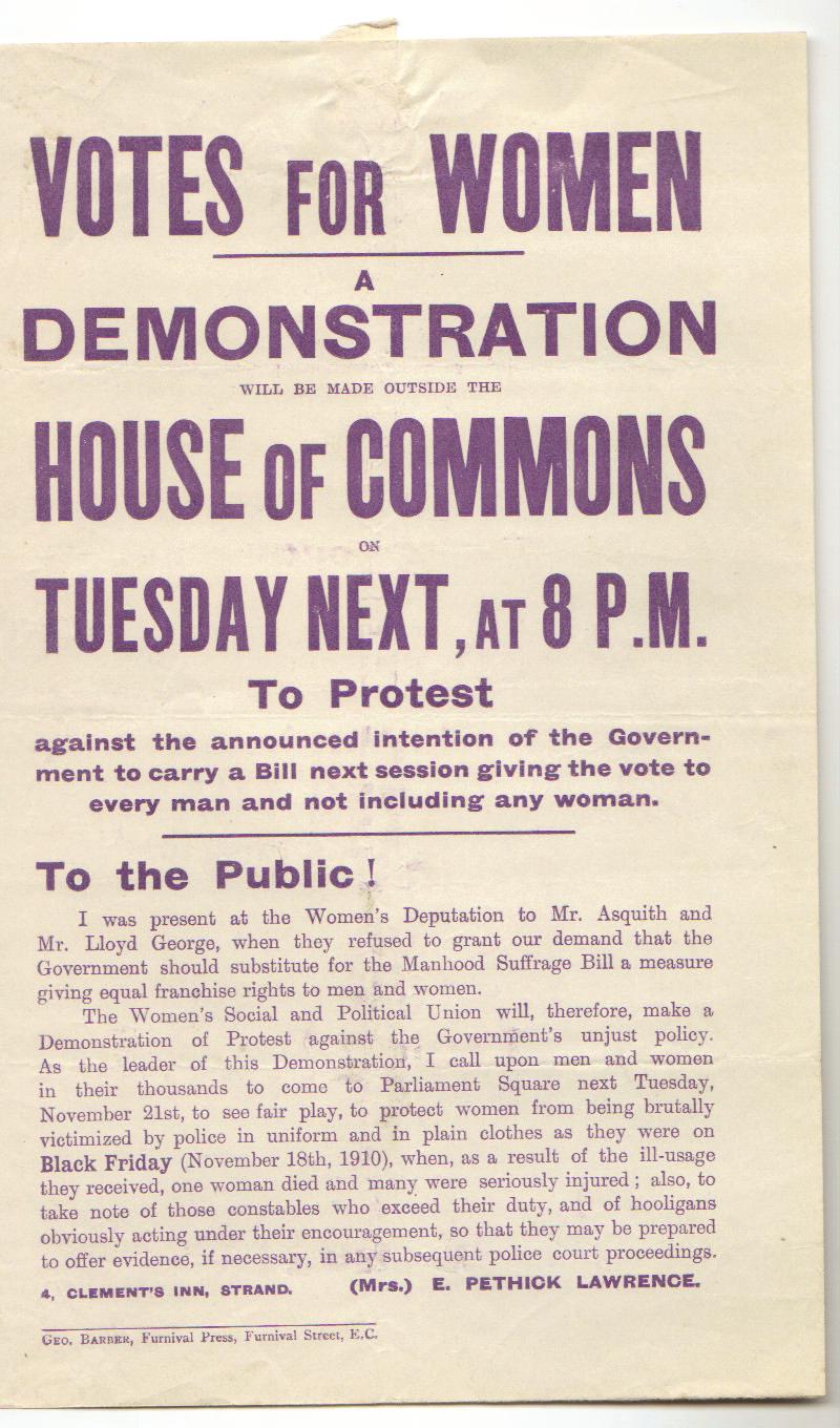 Suffrage Stories/Collecting Suffrage: Countdown To 12 October And Release Of The Film ‘Suffragette’: Flyer for WSPU Window-Smashing Demo on 21 Nov 1911