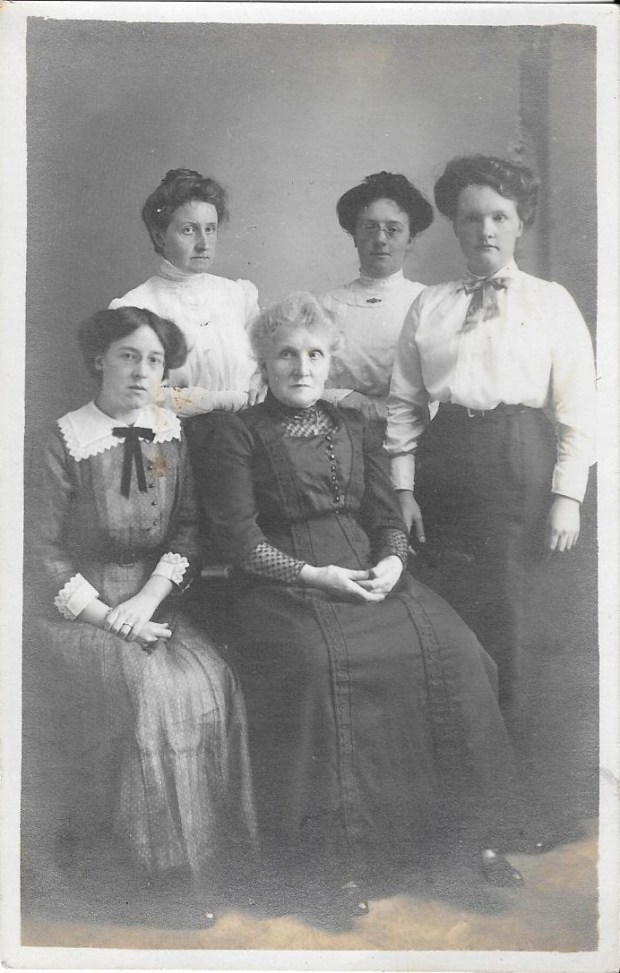 Women of the Hodgson family. With mother, Jemima, in the centre it is thought that Grace is on her right, with Mabel back left, next to Florence and with Edith on the right (Photo courtesy of Mabel’s descendants)