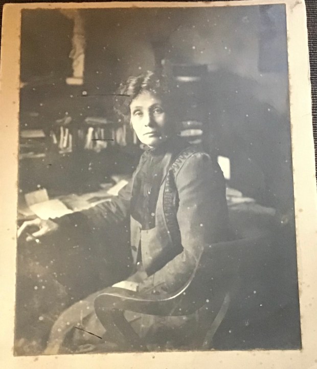 This photograph of Mrs Emmeline Pankhurst probably dates from c 1907, taken at her desk in Clement’s Inn, headquarters of the Women’s Social and Political Union.