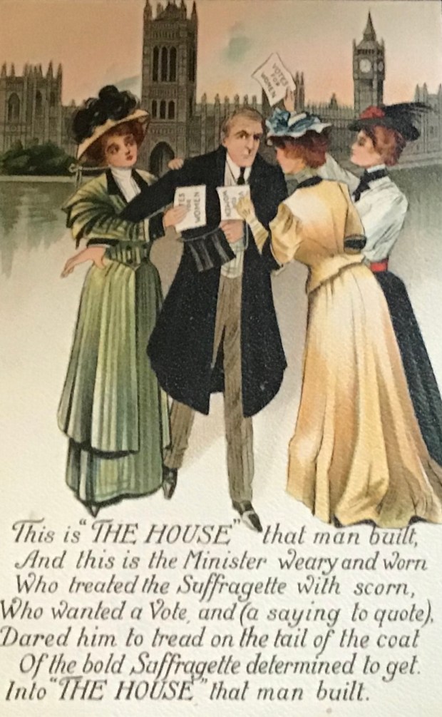 And this is the Minister weary and worn/Who treated the Suffragette with scorn,/Who wanted a Vote, and (a saying to quote),/ Dared him to tread on the tail of the coat/Of the bold Suffragette determined to get,/Into ‘THE HOUSE’ that man built.’