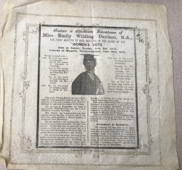 Souvenir tissue napkin for Emily Wilding Davison’s funeral: Mrs Sarah Burgess, printer SOLD