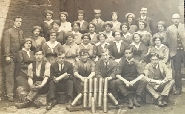 Munition workers – mainly women -pose for the photographer. They are wearing their caps and the triangular-shaped munition workers badge can be seen pinned to many of the overall dresses. Young men sit at the front – displaying the fruits of their labours – shells.