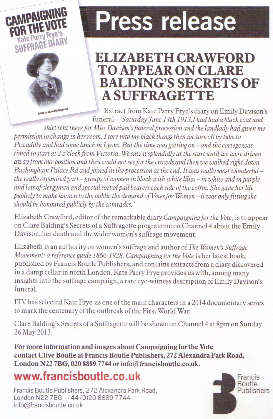 Wrap-around paper covers, 226 pp, over 70 illustrations, all drawn from Kate Frye’s personal archive. ISBN 978 1903427 75 0 Copies available from Francis Boutle Publishers, or from Elizabeth Crawford – e.crawford@sphere20.freeserve.co.uk (£14.99 +UK postage £2.60. Please ask for international postage cost), or from all good bookshops. In stock at London Review Bookshop, Foyles, Daunt Books, Persephone Bookshop, Newham Bookshop and National Archives Bookshop.