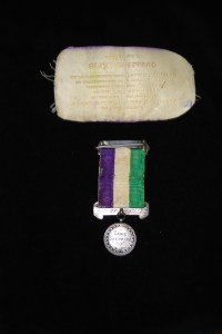 Each medal was presented in a purple box, with a green velvet lining. As can be seen in the photograph, a piece of white silk that originally went inside the lid was printed in gold with: ‘Presented to [name] by the Women’s Social and Political Union in recognition of a gallant action, whereby through endurance to the last extremity of hunger and hardship a great principle of political justice was vindicated’.