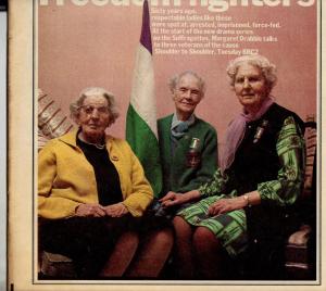 Mrs Pankhurst chose to be photographed wearing her ‘Holloway’ brooch in this photograph- as, 65 years later, did the elderly suffragettes, Leonora Cohen and Grace Roe . The latter two, like many other women, had received both of the WSPU accolades.