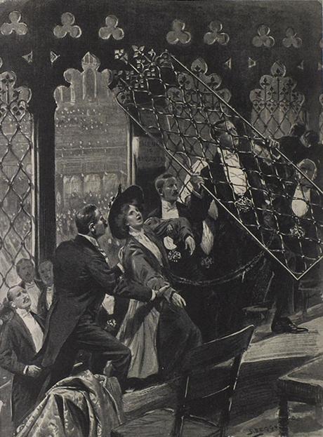 Muriel Matters chained to the grille in the Ladies’ Gallery. (Image from the ‘Illustrated London News’, courtesy of the House of Commons Library)