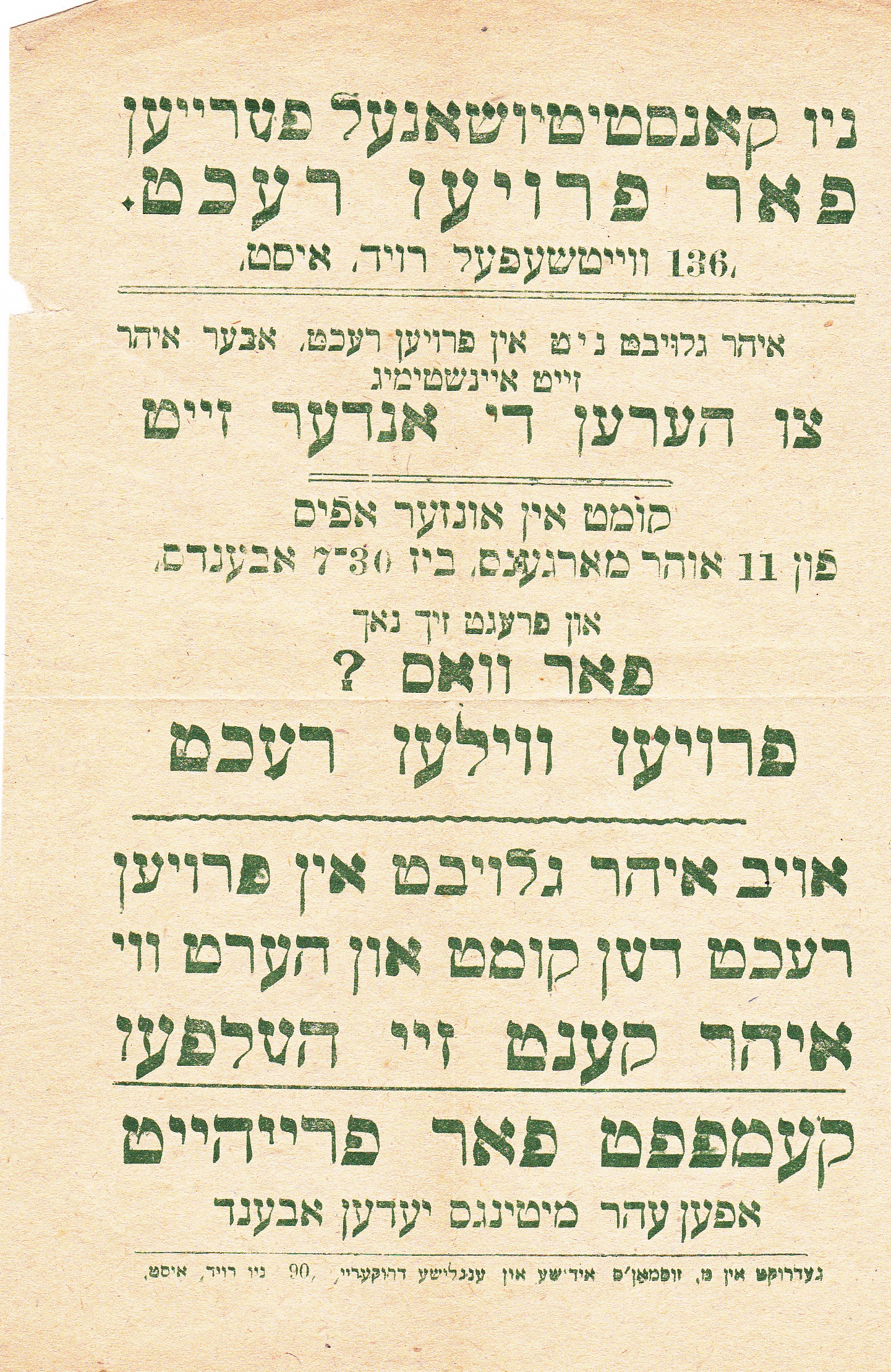 This leaflet, printed in Yiddish, was saved by Kate Frye from the quantity she delivered and is on display, together with her diary open at the entry for 27 September 1913, in which she describes a tea party the NCS gave for the local woman and girls, writing: