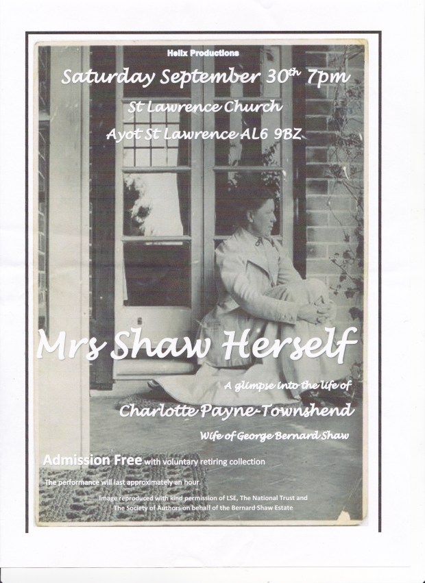 Charlotte Shaw was a very interesting woman – who evaded the limelight. At the Shaw/Wells/LSE conference we were treated to an excerpt from ‘Mrs Shaw Herself’ – a one-woman show – with musical accompaniment- about her. I thoroughly enjoyed this and thought I must let you all know that there will be a full perfomance next Saturday (30 Sept 2017) in St Lawrence Church in Ayot St Lawrence, the village where she and GBS made their home.