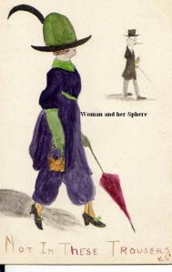 is the caption to a hand-painted postcard (the artist has initialed it ‘K.S.’). The subject of the remark is a lady in a purple and green outfit – a long tunic over ‘harem’ trousers – wearing a green and purple hat and carrying an umbrella. The author of the remark, a dapper gentleman, stands in the background.