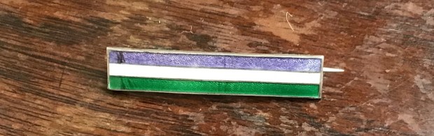 A silver and enamel Women’s Social and Political Union brooch. It was Sold to raise funds for the WSPU and was made by Toye and Co of Clerkenwell Road, London, the firm that made the WSPU’s hunger-strike medal. There is so much spurious material sold as ‘suffragette jewellery’; this is the Real Thing.