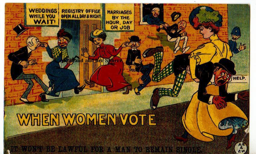 ‘WHEN WOMEN VOTE It won’t be lawful for a man to remain single’. All the men are being rushed into marriage – tweaked by the nose and carried under the arms of women – and all because they have a vote!