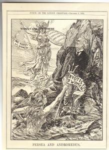 PUNCH CARTOOON – 2 December 1908 – a Bernard Partridge full-length illustration shows Asquith (Andromedus) chained to his rock – beset by the sea monster taunting him with her Votes for Women triton and searching for salvation from Persea – the Women’s National Anti-Suffrage League.