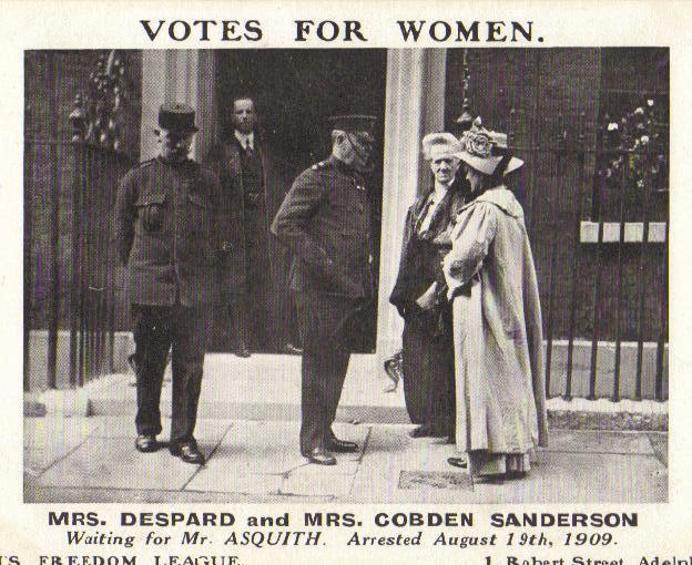 By 1909 Kate Frye was keenly involved – as a volunteer – in the women’s suffrage campaign. Although she belonged to the constitutional London Society for Women’s Suffrage she was happy to give her services to other, more militant, suffrage societies – such as the Women’s Freedom League.