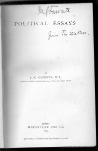 The Irish economist John Cairnes had long been a friend of Henry Fawcett, both part of the Blackheath circle centring on John Stuart Mill. When Millicent Fawcett (aged 23) published her ‘Political Economy for Beginners’ in 1870 Cairnes took it seriously, reviewed it and wrote to her ‘I have just finished my study of your useful little book and send you by this post my notes upon it. You will find I have some serious controversies with you.’ Three years later, when he published ‘Political Essays’ , he sent Millicent a copy – inscribing it ‘MG Fawcett from the author’.