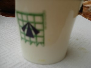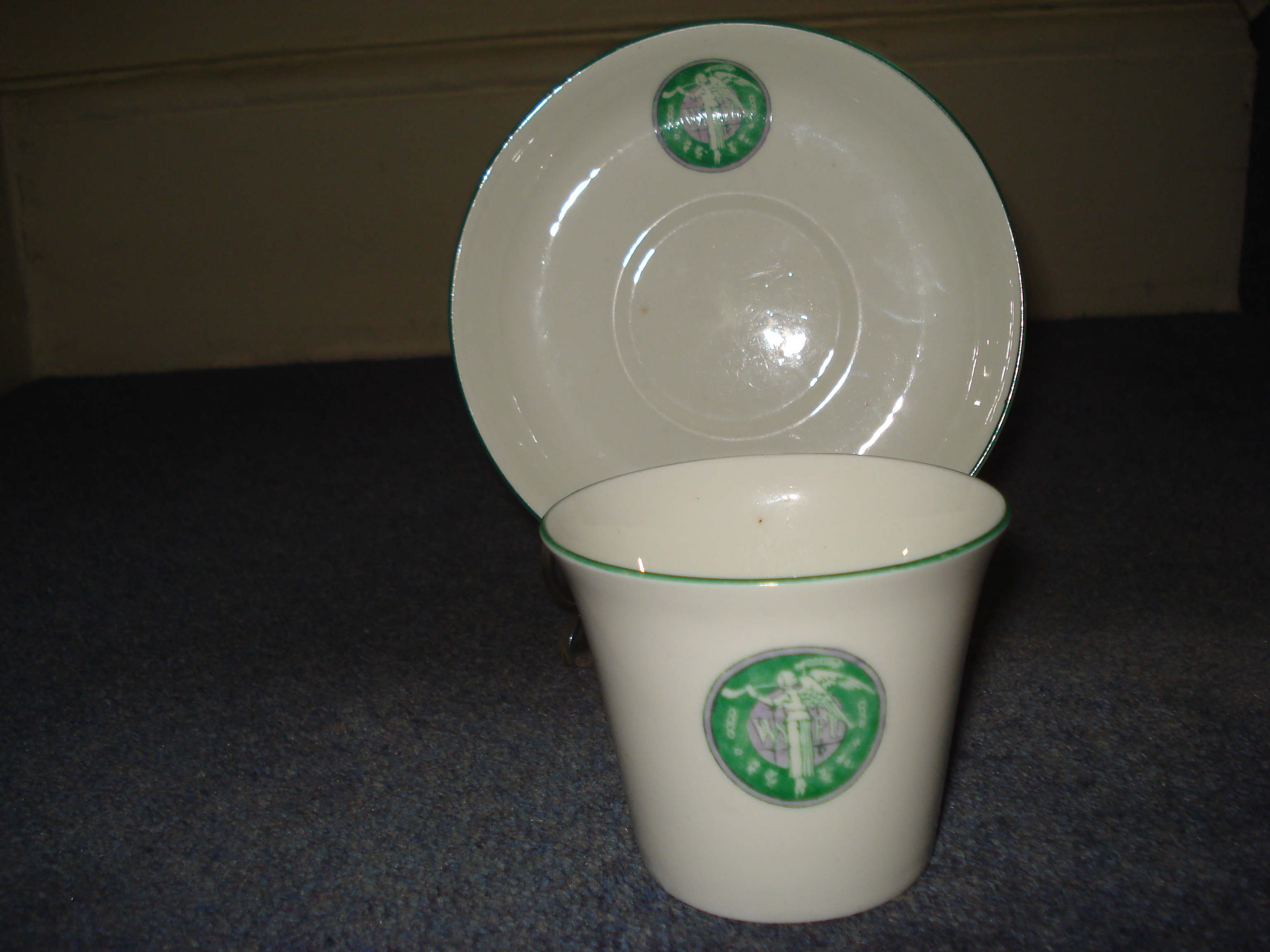 I have only ever had in stock – and that only fleetingly – this cup and saucer (see left), part of the third identifiable range of WSPU-commissioned china. I believe, however, that the People’s Palace in Glasgow holds a similar two pieces . They formed part of the Scottish version of the Prince’s Rink tea service, commissioned from the Diamond China Co, another Longton pottery, for use at the refreshment stall at the Scottish WSPU Exhibition held in Glasgow at the end of April 1910. Here the ‘angel of freedom’ is allied, on white china, with the Scottish thistle, handpainted, in purple and green, inside transfer outlines. After the exhibition this china, too, was sold – Votes for Women, 18 May 1910, noting that ‘a breakfast set for two, 11s; small tea set 15s , whole tea set £2, or pieces may be had singly’. It will hardly surprise readers to learn that WSPU china – now so very rare – commands a very high price. But what a wonderful addition a piece would make to any suffrage collection.
