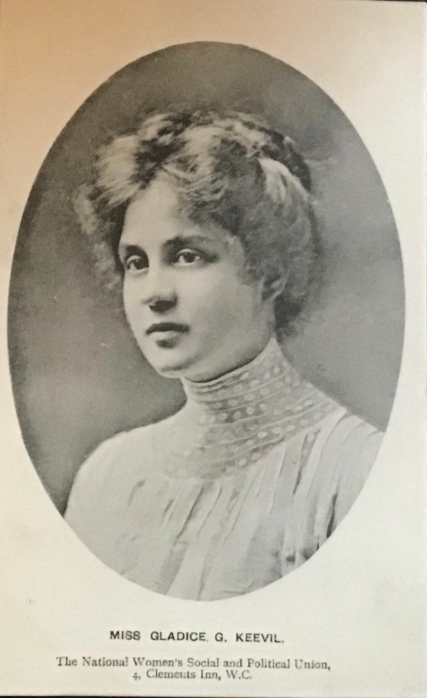 The photographer was Lena Connell, who, in an interview in the Women’s Freedom League paper, The Vote, dated her involvement with the suffrage movement to this commission. When she arrived at Lena Connell’s St John’s Wood studio in 1908 Gladice Keevil had not long been released from prison and was soon appointed National Organizer for the WSPU in the Midlands.