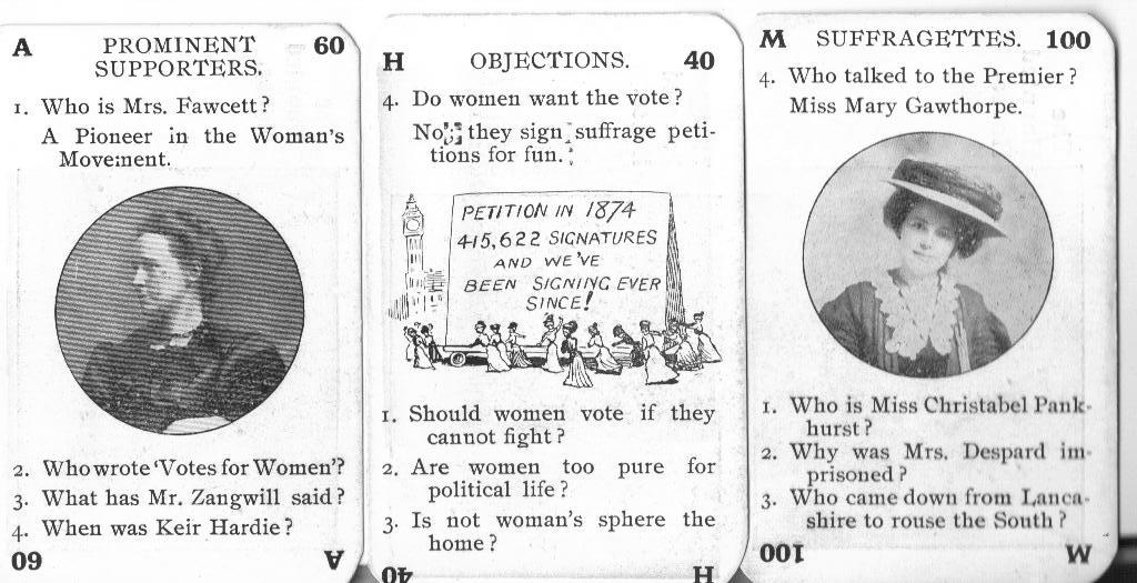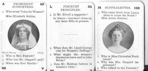 The game comprises 54 cards (all present) divided into 13 sets of 4 cards each – one of the odd ones being known as ‘The Bill’ – and the other a spare which has been used to record the score of a game played long ago by 6 people, designated by their initials. All the sets have names: eg. Prominent Supporters, Arguments, Freewomen, Voteless Women etc – and each card poses a series of questions. Some of the cards also carry photographs – of Christabel Pankhurst, Annie Kenney, Mrs Fawcett, Elizabeth Robins, Israel Zangwill, and Mary Gawthorpe.