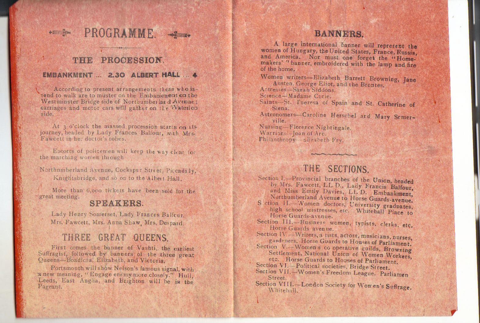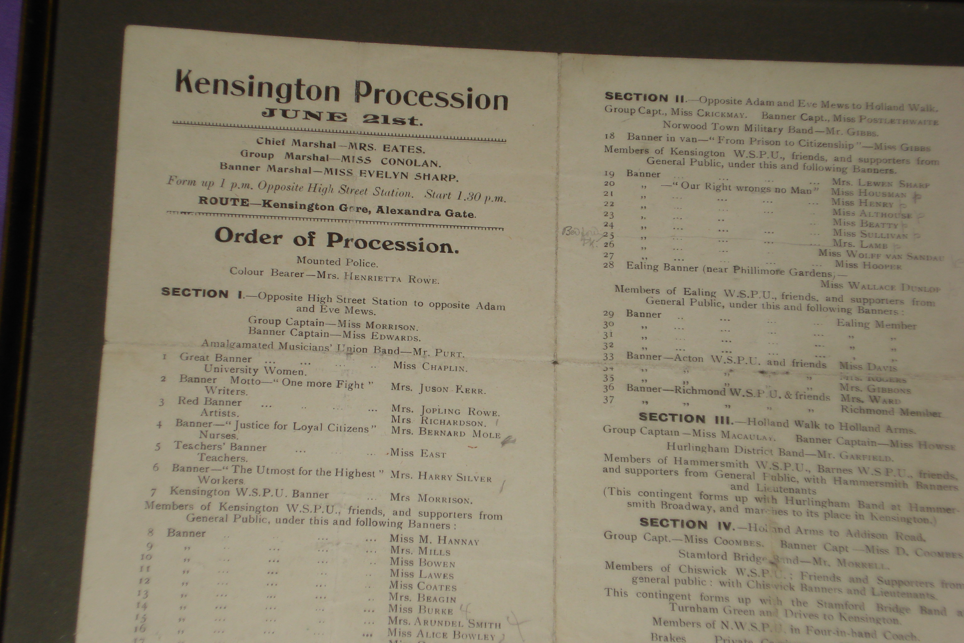 This programme belonged to Isabel Seymour, an early worker in the WSPU Clement’s Inn office, She folded the programme into her pocket or handbag and then kept it for the rest of her life.