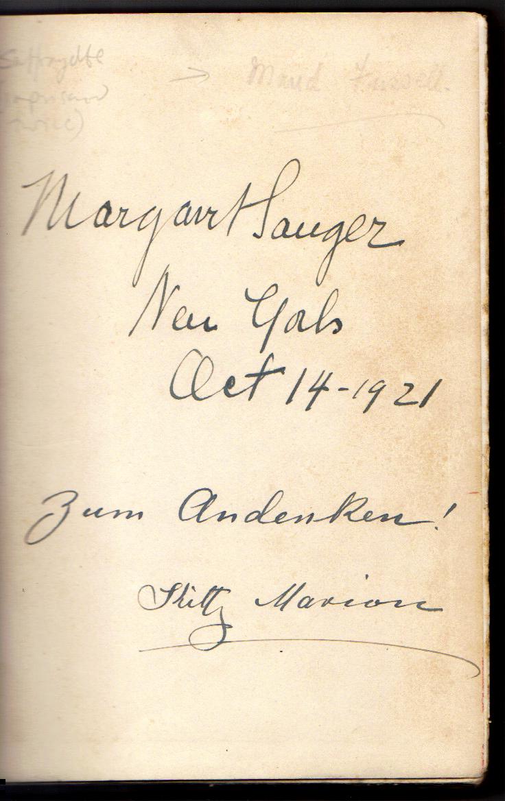 My reconstruction of the history of the book is that it was signed by Margaret Sanger for Kitty Marion and was subsequently given by Kitty Marion to Maud Fussell. It was sold to me along with other books that had been in Maud Fussell’s possession.
