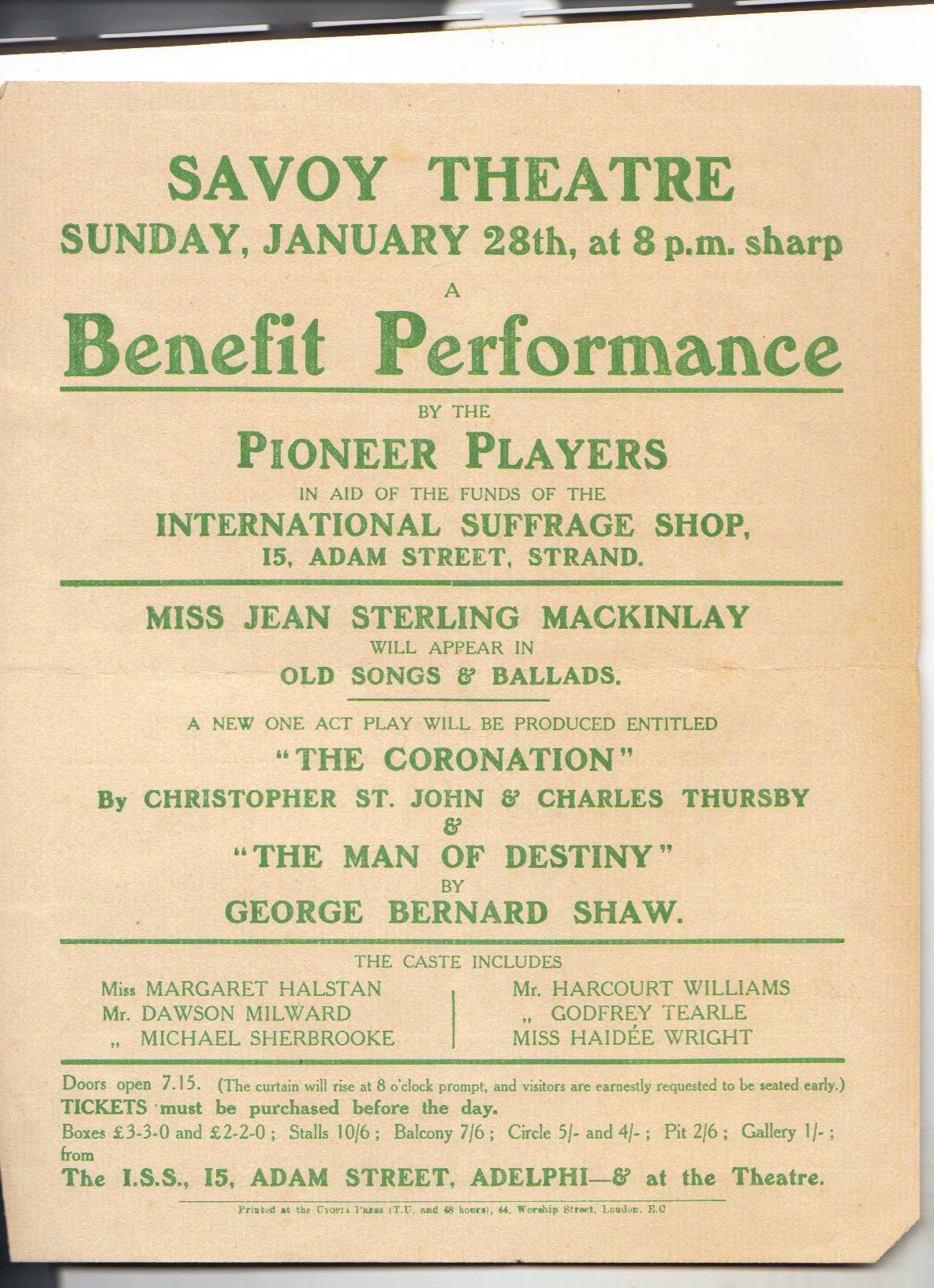 Kate Frye (suffrage diarist) saw the play on 16 April and wrote a long entry that night in her diary where, including, amongst other comments, ‘I loved the piece – it is quite fine – most cleverly written and the characters are so well drawn. Needless to say the acting was perfection as it generally is at the Court Theatre and the second act – the meeting in Trafalgar Square – ought to draw the whole of London. I was besides myself with excitement over it ‘