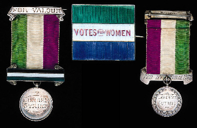 A silver and enamel Women’s Social and Political Union brooch. It was Sold to raise funds for the WSPU and was made by Toye and Co of Clerkenwell Road, London, the firm that made the WSPU’s hunger-strike medal. There is so much spurious material sold as ‘suffragette jewellery’; this is the Real Thing.