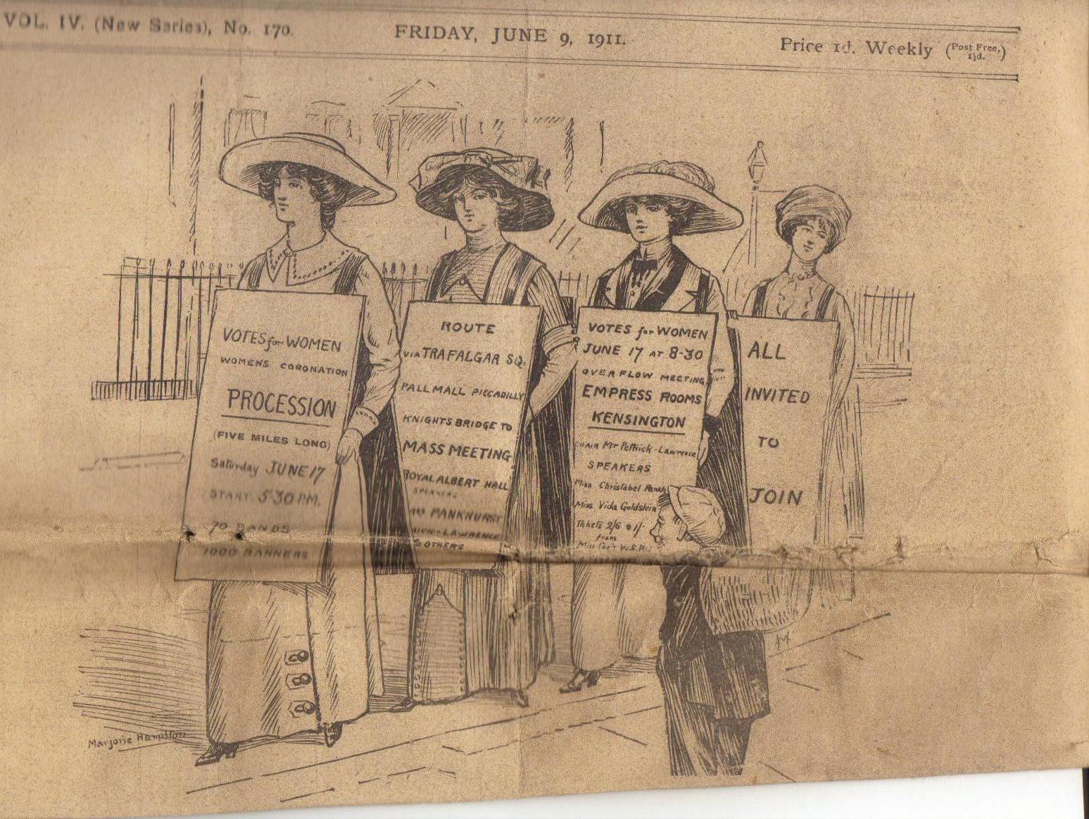 Mother went to a Lecture for the NKWLA [North Kensington Women’s Liberal Association] at the Club and Agnes and I started at 8 o’clock and walked to Mrs Haddesley [sic] for a drawing-room Suffrage Meeting at 8.30. Agnes and I stewarded and made ourselves generally useful. The Miss Porters were there and a girl who I saw at the Speakers’ Class on Wednesday. Alexandra was in the Chair and spoke beautifully – really she did. And Mrs Stanbury spoke. Mrs Corbett and Mrs George – all very good speakers. Mrs Stanbury was really great and there were a lot of questions and a lot of argument after, which made it exciting. It was a packed meeting but some of the people were stodgy. Miss Meade was there with a friend – her first appearance at anything of the kind she told us and she said it was all too much for her to take in all at once. The “class” girl walked with us to her home in HollandPark and we walked on home were not in till 11.45. I was awfully tired and glad of some supper and to get to bed.